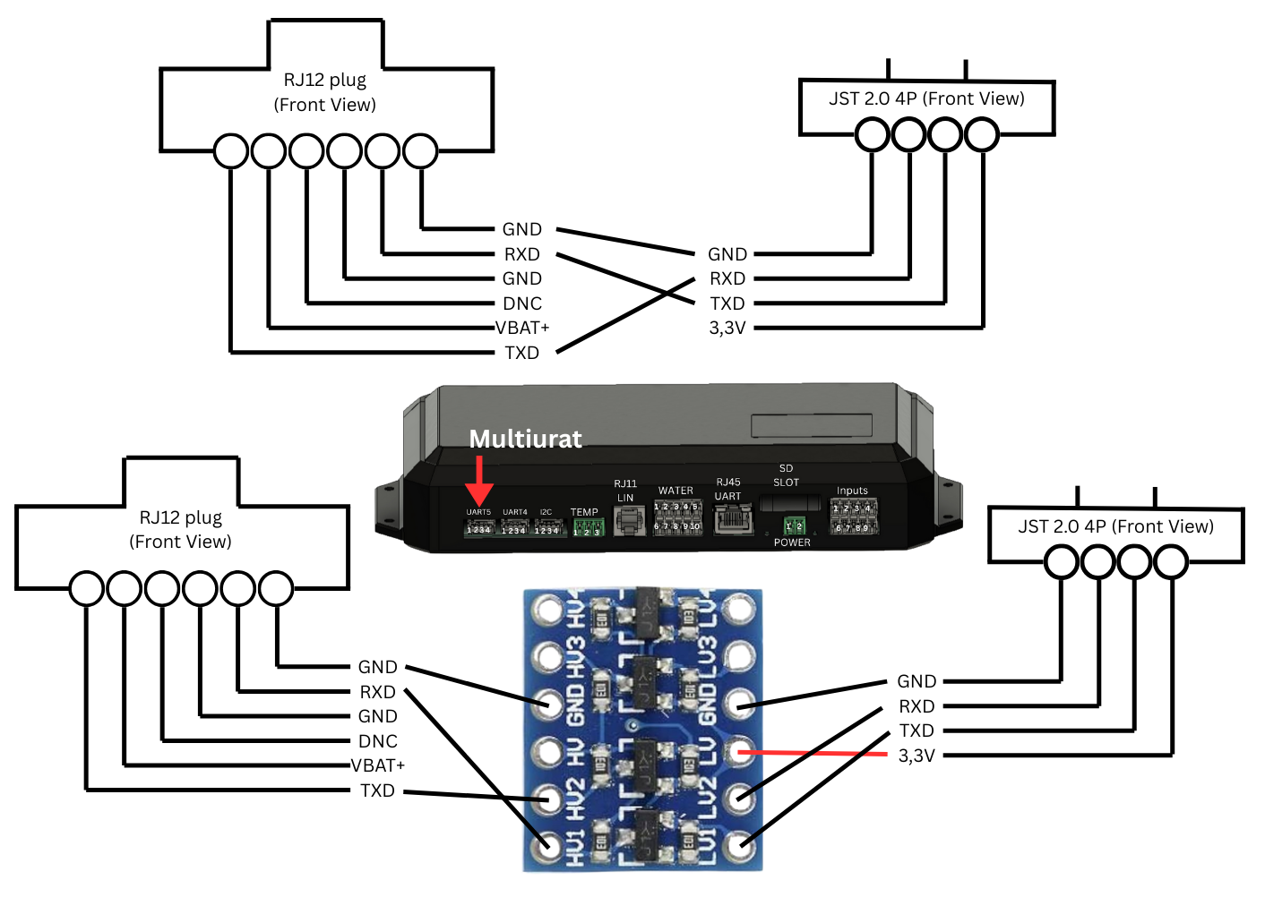 ⚠️ **Wichtiger Hinweis:**&#x44;er **MultiUART ist für ein 3,3V-Pegelsignal ausgelegt**, während die Votronic Solarregler mit **5V-Pegeln** arbeiten.In Tests hat der Raspberry Pi zwar ohne Pegelwandler funktioniert, aber zur Vermeidung von Schäden wird der **Einbau eines Pegelwandlers dringend empfohlen**.
